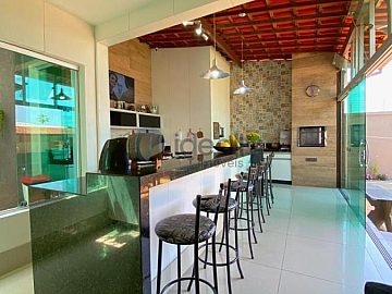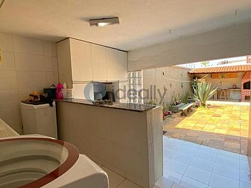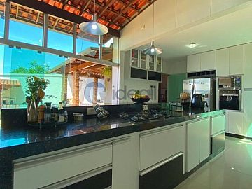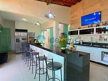Nos fundos, área gourmet com churrasqueira, bancada granito ;