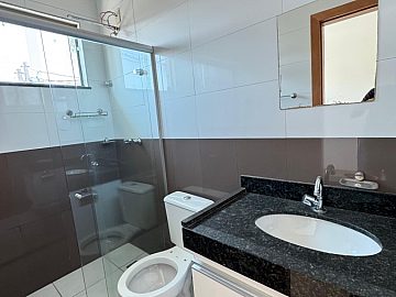 São 2 quartos, ambos suítes, além de um banheiro social no térreo.